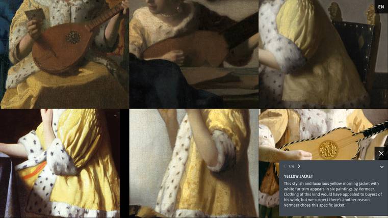 Where in other experiences the focus is often on individual works, here it is on the overview of the various works next to each other. The Vermeer experience juxtaposes the paintings in different ways by applying movement and specific cut-outs, so that you as a visitor can discover Vermeer's themes. The experience also offers a rare opportunity to compare recurring motives throughout Vermeer’s paintings: such as pearls, yellow jackets, curtains, maps and the use of the ultramarine. In addition, you will also discover the different emotions of stillness and wonder in the groups of paintings. From the first moment, the movement provides a telling story, in which the User Interface can quickly fade into the background.